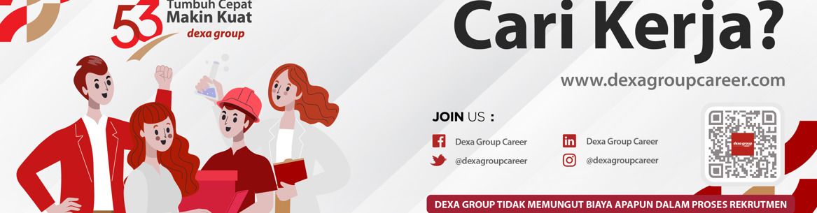 Sebagai bagian dari tim Dexa Group, Anda akan menjadi elemen kunci dalam mencapai visi perusahaan. Dexa Group adalah perusahaan yang komitmen untuk memberikan pelayanan berkualitas tinggi kepada klien kami. Kami keyakinan bahwa staf kami adalah nilai tambah yang berharga dan keberhasilan kami ditentukan pada dedikasi dan sumbangan mereka.
